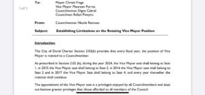 Aquí surge la pregunta clave: ¿cómo es posible que, si los estatutos de la carta constitutiva de la Ciudad de Doral establecen que cualquier miembro del concejo debe proponer puntos para la agenda al menos siete días antes de la reunión, ya exista una resolución propuesta por una futura concejal que aún no ha sido juramentada?