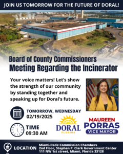 A través de un comunicado publicado en su página web, invitó a la ciudadanía para que el día de hoy miércoles 19 de febrero, acompañen a la Junta de Comisionados del Condado, quienes “tomará una decisión crítica sobre la ubicación de la nueva instalación de conversión de residuos en energía. Esta es nuestra oportunidad de asegurarnos de que Doral ya no sea considerado”.