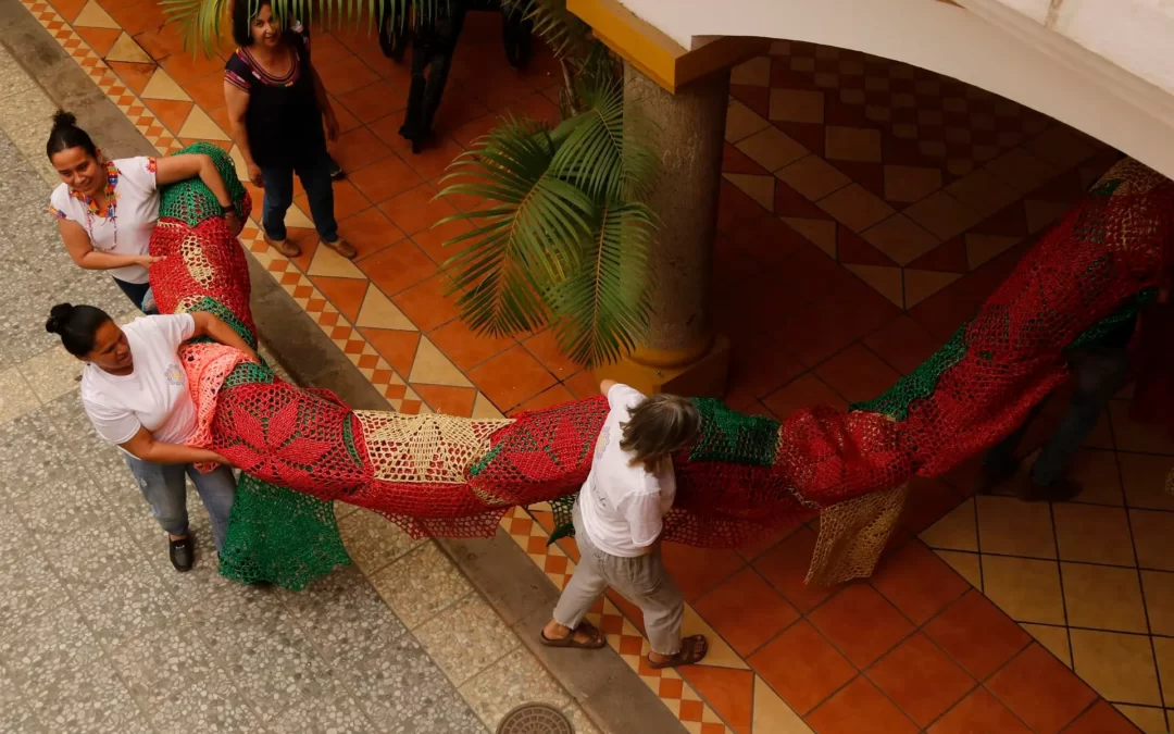 Una decena de mujeres conversan y ríen juntas mientras el hilo de plástico que llega hasta sus manos se convierte en coloridos tapetes del tamaño de un abdomen y que juntos forman un gran pabellón de crochet que será colgado en alguna parte de México.