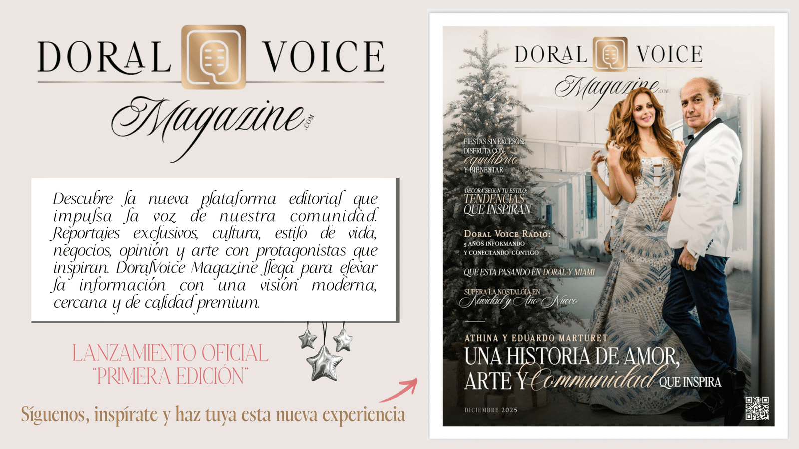 Bienvenido a DoralVoice Magazine, la plataforma editorial que celebra las historias, los talentos y la visión de Doral, Miami y nuestra comunidad hispana. Reportajes exclusivos, cultura, estilo de vida, tendencias, bienestar, arte, negocios y opinión con sello editorial premium.
