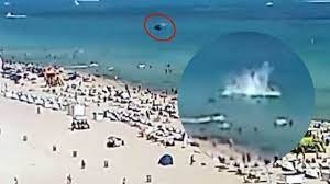 Un video difundido por la policia muestra al helicoptero cayendo sobre el oceano y chocando en las aguas cerca de personas que nadaban frente a la playa.