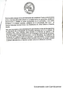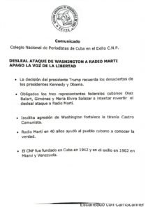 El Decano del C.N.P., Salvador Romaní Orúe, acompañado por los Vicedecanos Dr. Omar Estacio y Eduardo Pantín, señaló en el documento que “este increíble ataque de la administración del presidente Trump contra la única arma y bandera del exilio cubano en su lucha contra los opresores, siembra el desconcierto”.